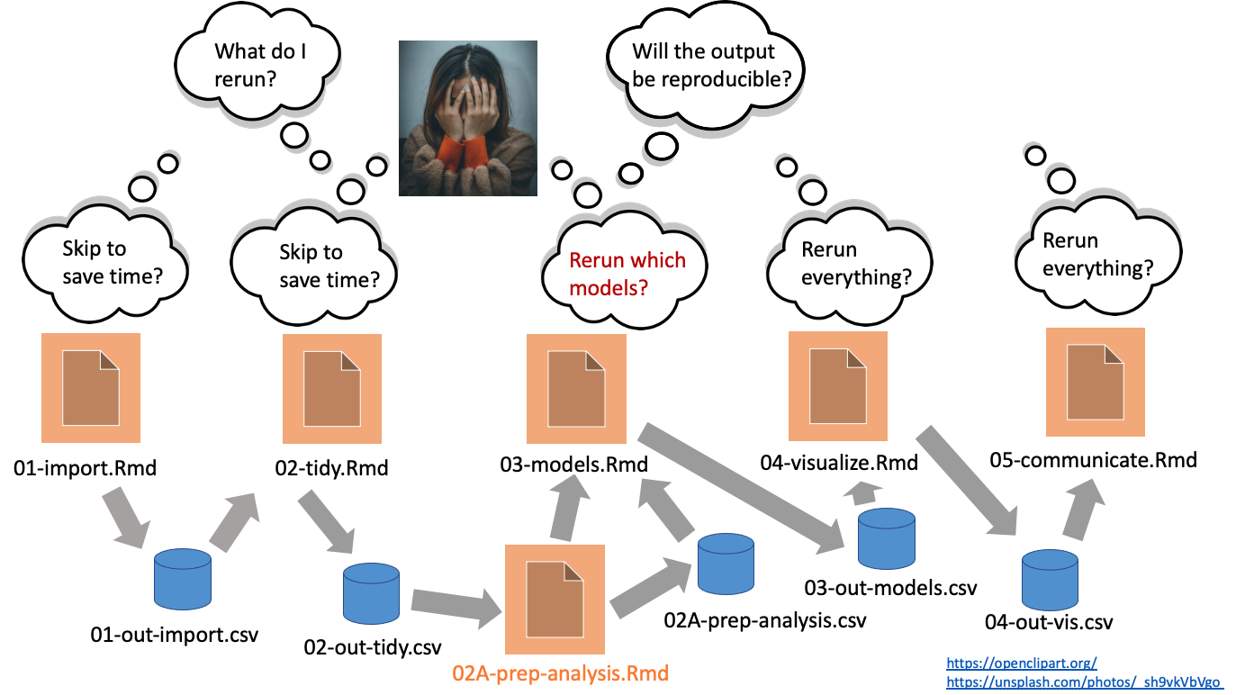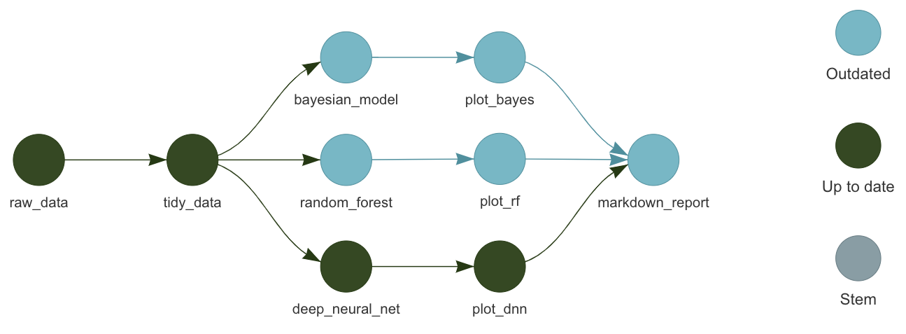 Cada target representa una tarea definida por funciones de R, y la estructura de dependencias entre ellos forma un gráfico acíclico dirigido (DAG) que targets utiliza para decidir qué ejecutar y qué saltarse.